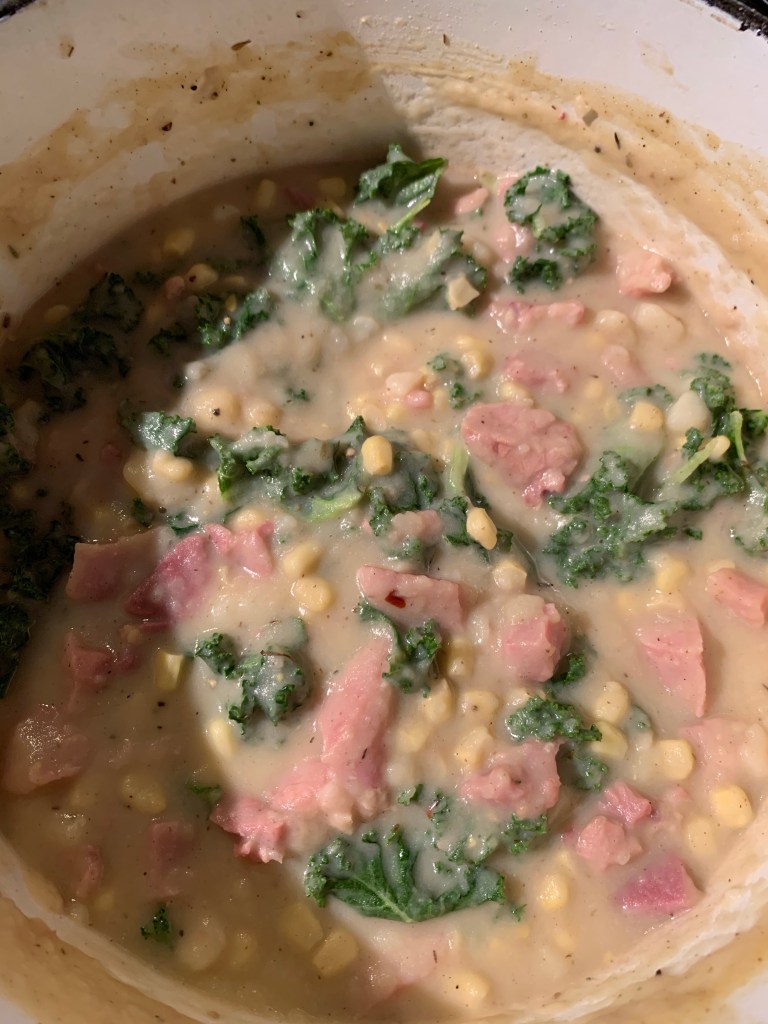 Once the garlicky mustard is mixed in, add the corn, ham and kale and cook till heated through. Simmer for another 20 minutes or until soup has thickened a bit. Serve with some crusty bread – this peasant bread is my family’s favorite – and dig in!