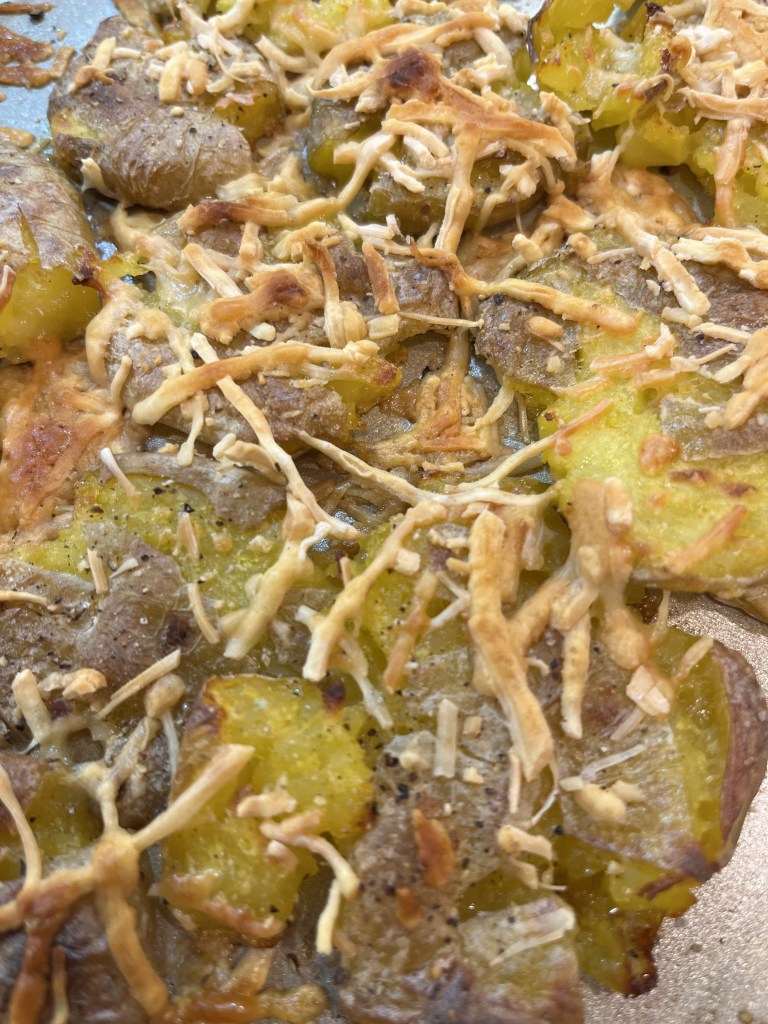 Drizzle with olive oil and salt and pepper and sprinkle herbs across the top (fresh or dried), garlic (fresh or jarred), and parmesan cheese. Pop in the oven until golden brown – about 20 minutes depending on the size (smaller will brown up more quickly than larger potatoes). Dig in.