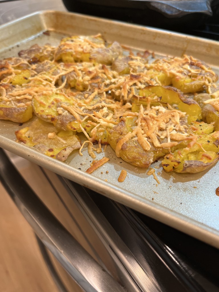 Preheat oven to 375. Microwave potatoes untll soft – between 5-10 minutes depending on size/amount. Then, using either the bottom of a cup, mason jar or a masher, mash the potatoes until flat and fluffy goodness is oozing out the top and sides.