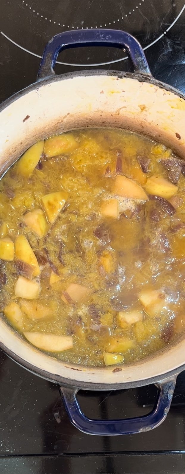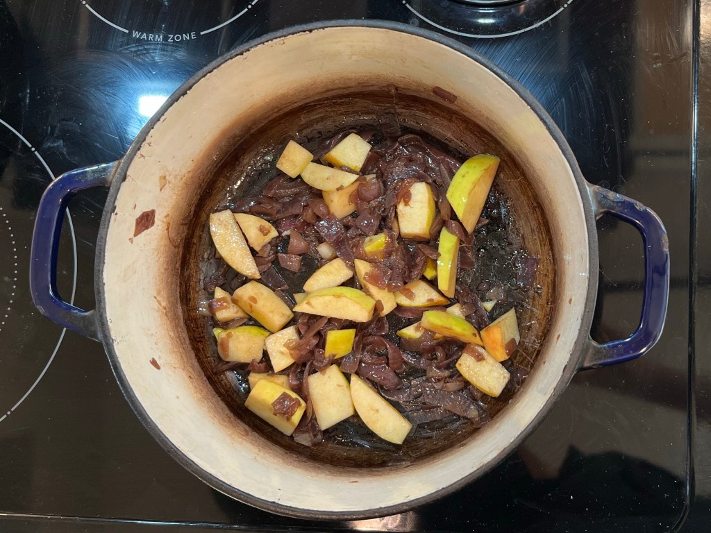 While the acorn is roasting, get your garlic ready and pop that in the oven. Slice your onions and begin to caramelize them. When they are almost finished add in your diced apple and sauté until nice and soft.