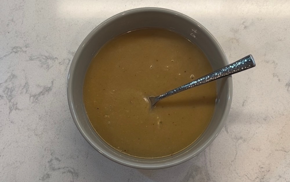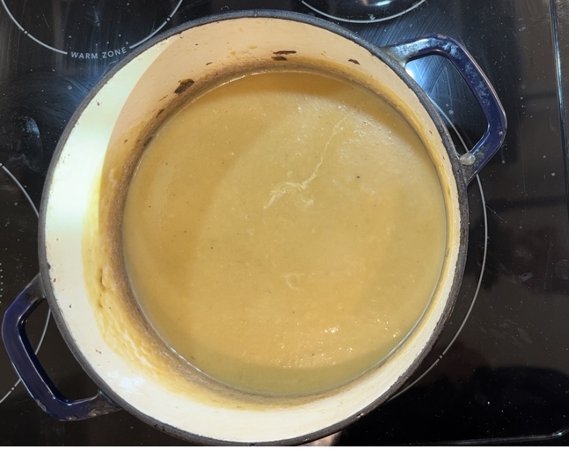 Once your squash and garlic are done cooking let cool until you can handle. Then scoop out the flesh and add to the pot of onions and apples. Add the roasted garlic and chicken broth. Using an immersion blender blend the ingredients together until nice and smooth. Add in the Garam Masala then salt and pepper to taste.