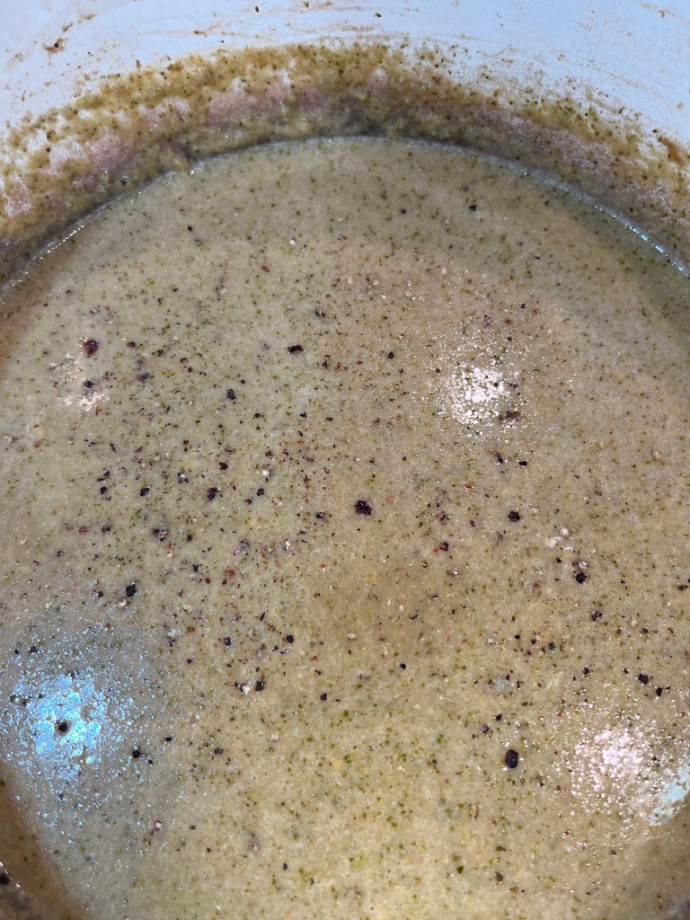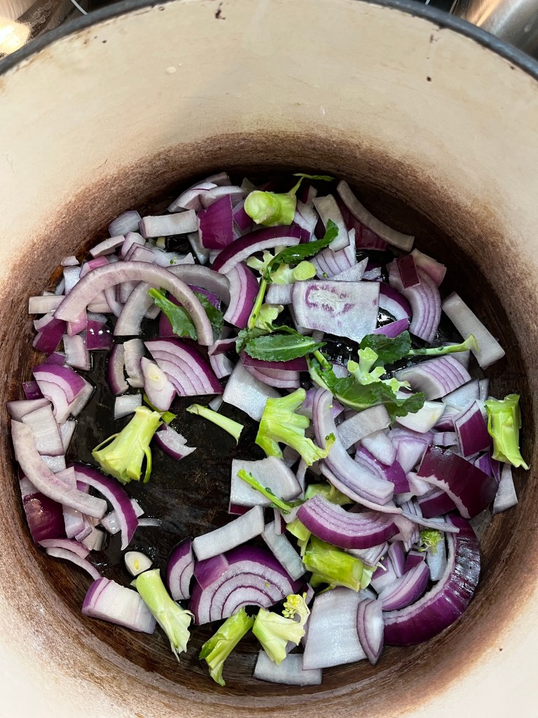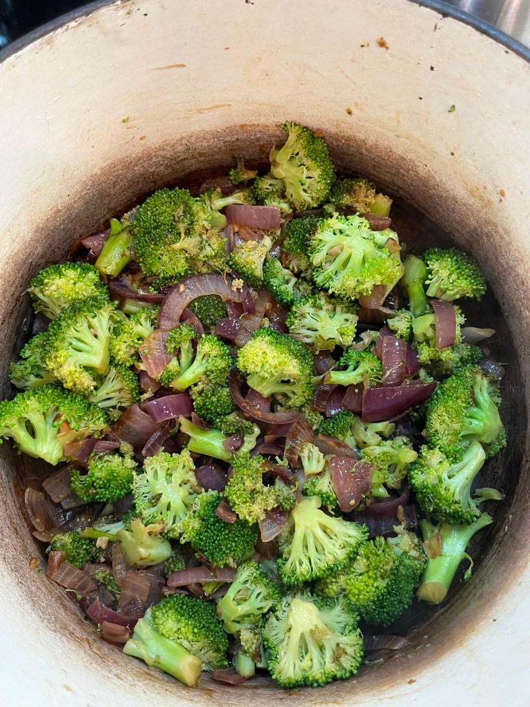 Sauté the onions until translucent then add the garlic and broccoli. Cook until soft – about 20 minutes. Add the flour and cook for two minutes.