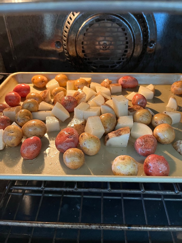 Preheat oven to 400. Throw your potatoes (I used a mix of small creamers and russets because that’s what I had) on a baking sheet and toss with grapeseed oil (I like to use grapeseed because it has a higher smoke point), salt and pepper. Pop them in the oven for 25 minutes or until soft and golden.