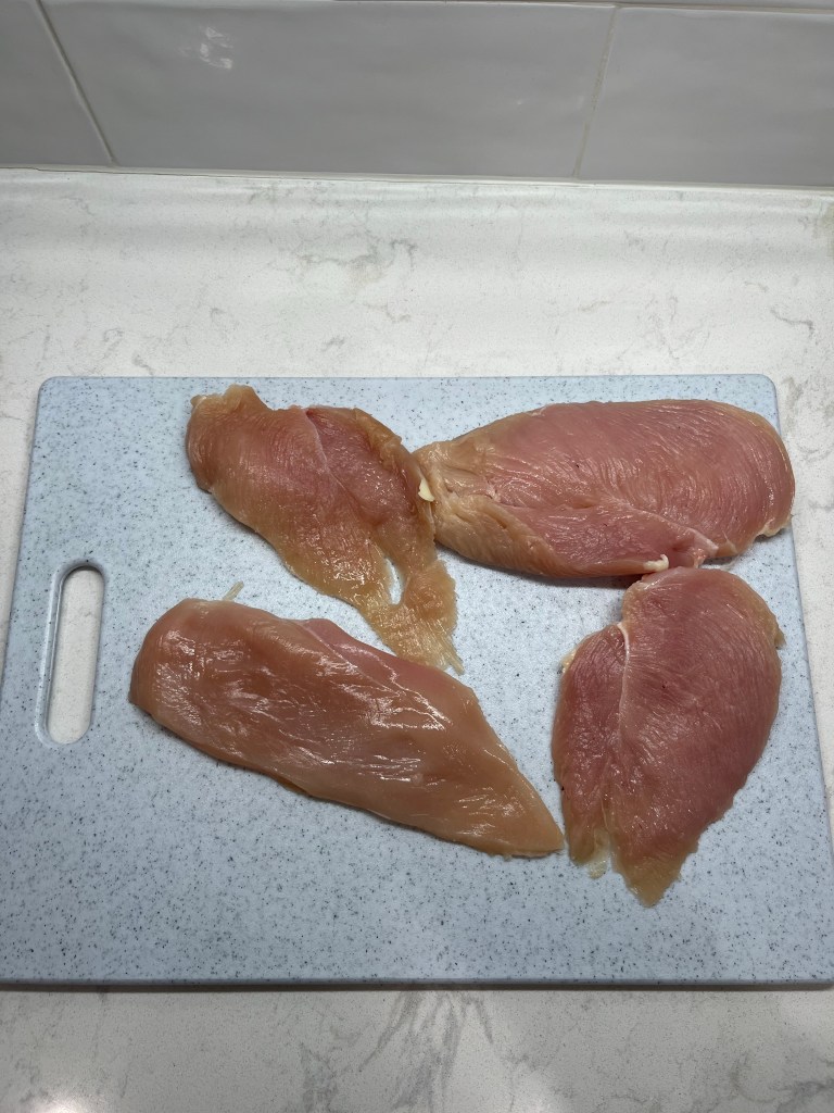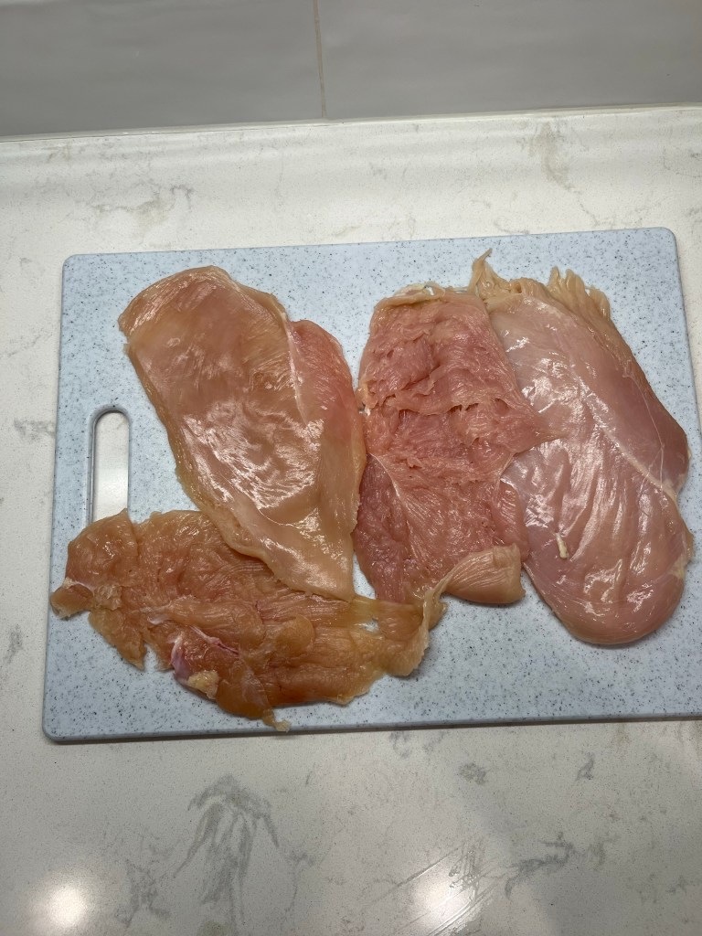 Add 3 tablespoons of olive oil to a large skillet, and turn on medium heat. While this is warming, slice your chicken breasts in half lengthwise, then – and this is the fun part! – use a kitchen mallet to pound them till they are 1/4 thick. For this recipe, thinner is better! See how much they’ve changed in the photos below? That’s what you’re looking for – nice thin cutlets.