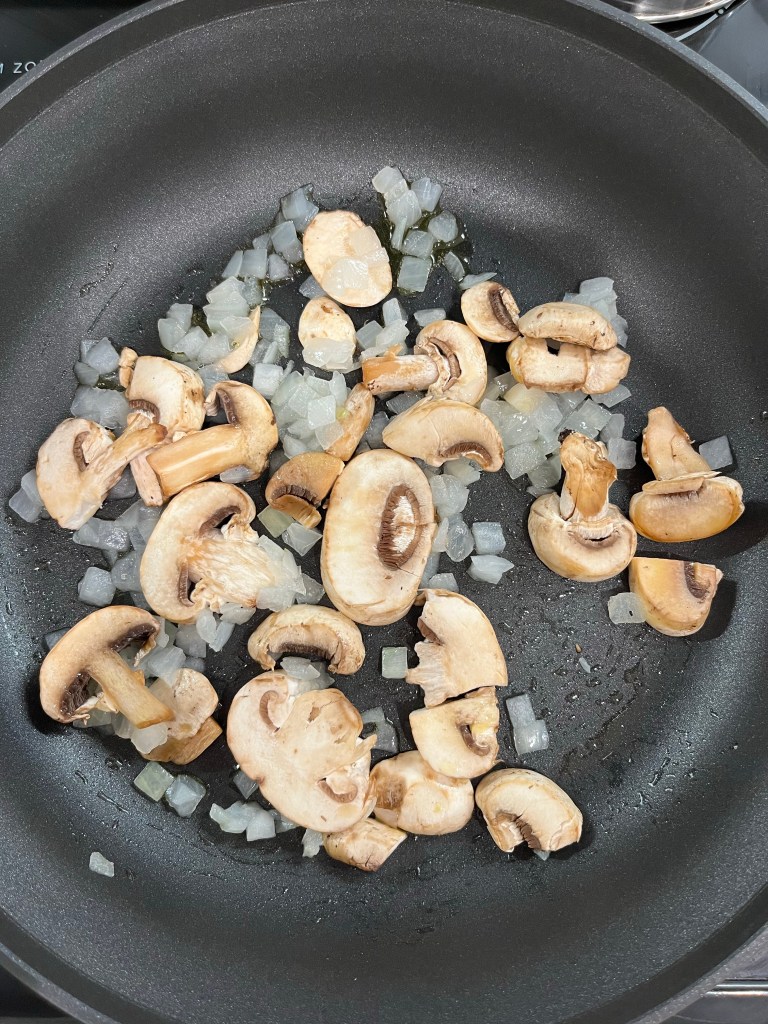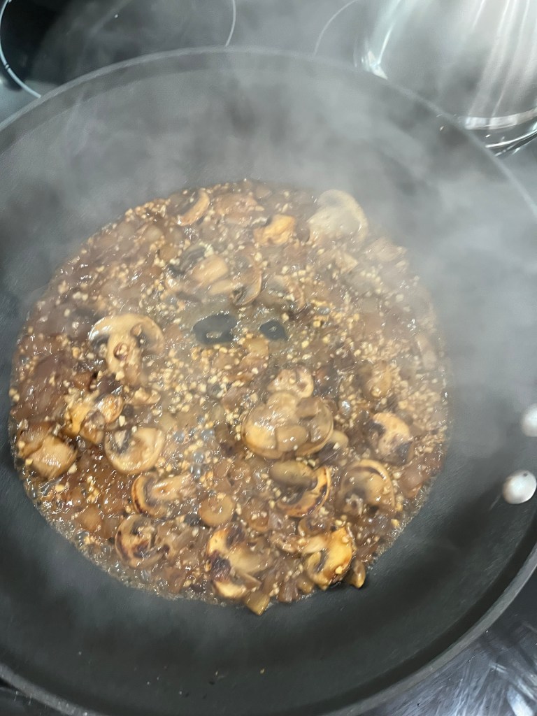 Using the deliciousness already brewing in your pan as a starting point, drop in the onions, and mushrooms. Sauté until soft and browned – should take about 10 minutes depending on the thickness of your mushrooms. Next, add the garlic and Thyme and cook until fragrant – about 2-3 more minutes.