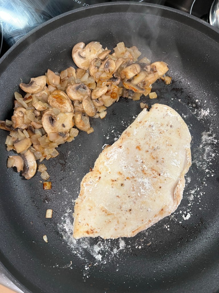 Using a large plate, dredge the chicken breasts through the flour and dust off. You want them to be coated, but not caked.