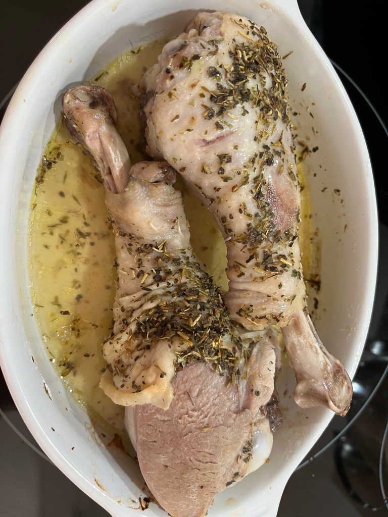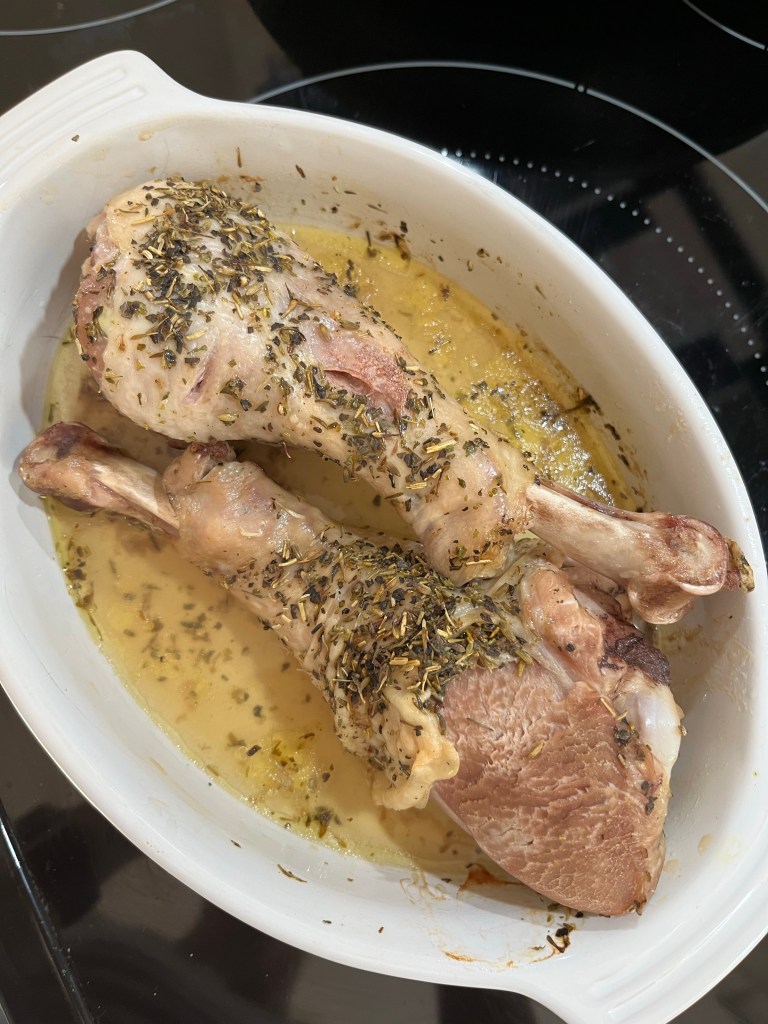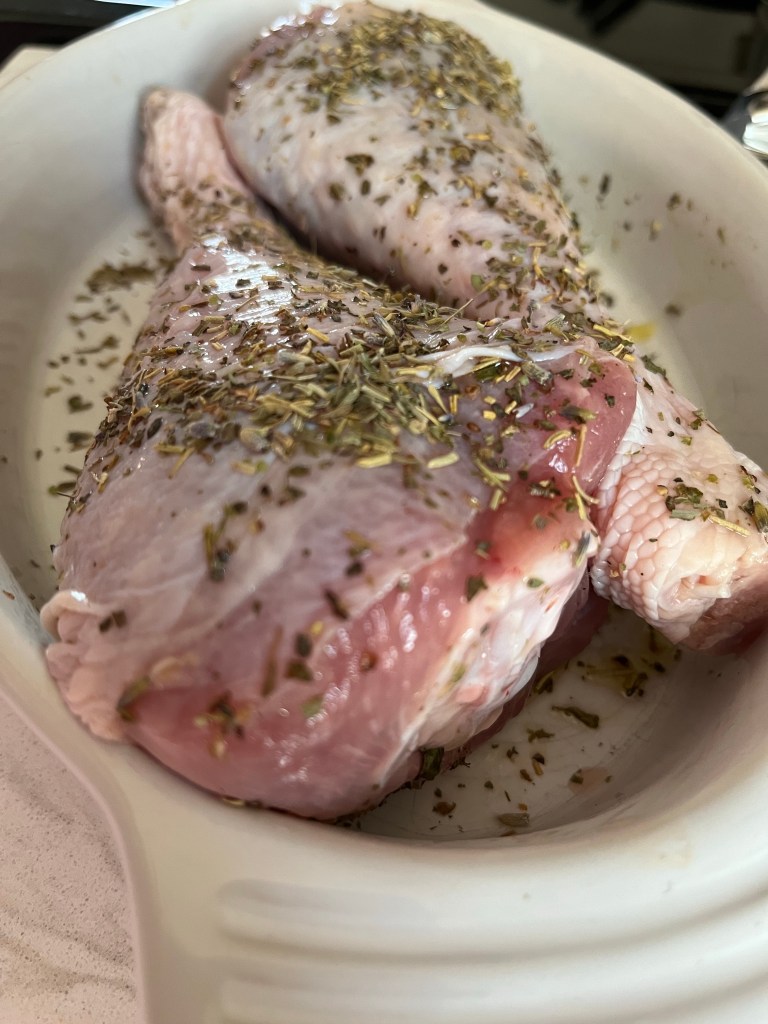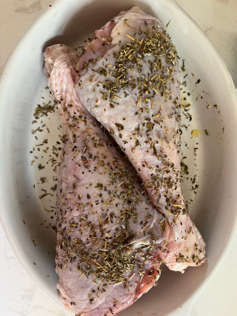 Place your turkey legs in a roasting dish, and drizzle with olive oil. Sprinkle your herbs and add some salt and pepper to taste. Rub the turkey legs so they are nice and coated. That’s it! Super simple.