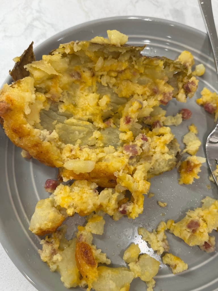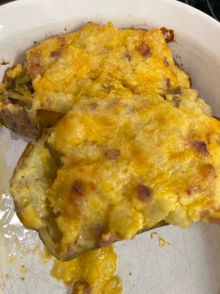 For my birthday a few days ago my hubby and a dear friend took me to dinner. I had Halibut with a lemon thyme sauce, broccoli and a twice baked potato. The broccoli was fine, but nothing to write home about – the halibut, however, was fabulous and the twice baked potato the perfect complement. I never would have thought to serve it but it was perfect. Needless to say I decided to recreate it! I haven’t tried the Halibut yet since the hubby isn’t a fish fan, but perhaps the next time he travels….I digress.
