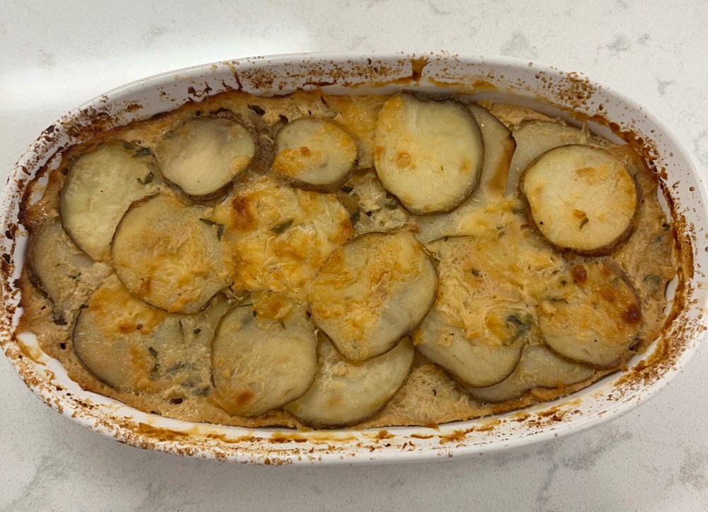 We had friends for dinner the other night, and I wanted something easy but delicious. Enter these potatoes. They’re really a cross between scalloped and au gratin, but because of the cheese, I’ve just got with au gratin. The highlight of the dish, however, is hands down the Tarragon. If you’ve never tried it, its similar to Rosemary but with Anise and Mint under/over tones. Probably my favorite herb - but its hard to find in the stores. Rosemary works just as well if it isn’t in stock. By steeping the Tarragon in the sauce, the flavor infuses into the cream and really makes the dish pop.
