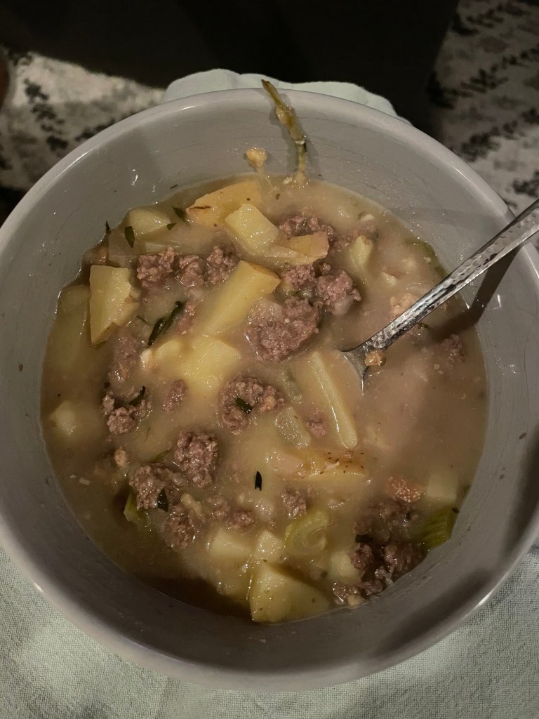 You know those days when you really want to eat a burger and fries, but don’t want the calories? This soup is the perfect solution. It’s hearty, filling, has red meat and potatoes, but won’t clog up the precious vessels that keep the ol’ ticker ticking. It’s super pliable – meaning – use whatever veggies you have in the fridge. Broccoli, carrots, celery, squash, kale, onions, etc. They all mix really well with the flavors here.