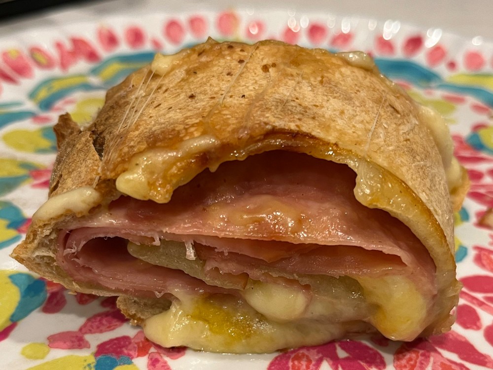 Roll out your pizza dough into a round shape about 10-12″ across. Smear with mustard across the dough, stopping about 1/2 inch from the edges. Layer your ham width wise across the dough and top with cheeses. Starting with the side nearest to you, roll the dough lengthwise – think of a cinnamon roll – and continue rolling until you have a nice log of dough. Pinch the ends shut and place on a cookie sheet seam side down. Cut three slits in the top to vent, and pop in the oven!