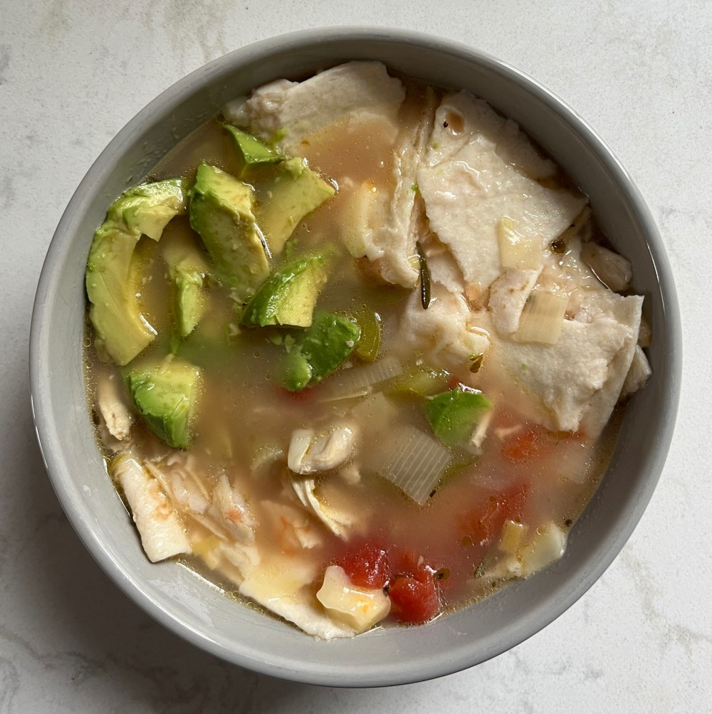 Grab four bowls then add shredded cheese and the tortilla strips to the bottoms. Carefully ladle in the soup, garnish with avocados, sour cream, more cheese or tortillas.