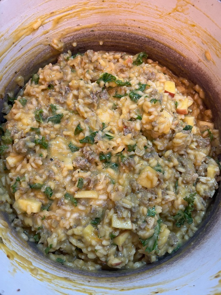 The apples add a nice crunch at the end, and the kale lends a touch of color and fiber. The roasted squash brings nuttiness while the sausage adds balance and spice. Popping in the fresh herbs at the end – takes this dish over the top. You’ll want seconds before you even plate your first bowl!