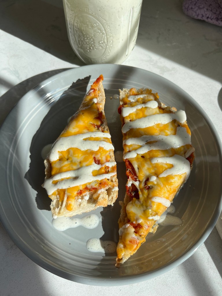 Pop into the oven and cook for 10-15 minutes or until cheese is melty and golden. Cut into “slices” and serve with more sauce, a drizzle of ranch (as seen above) or some hot pepper flakes.