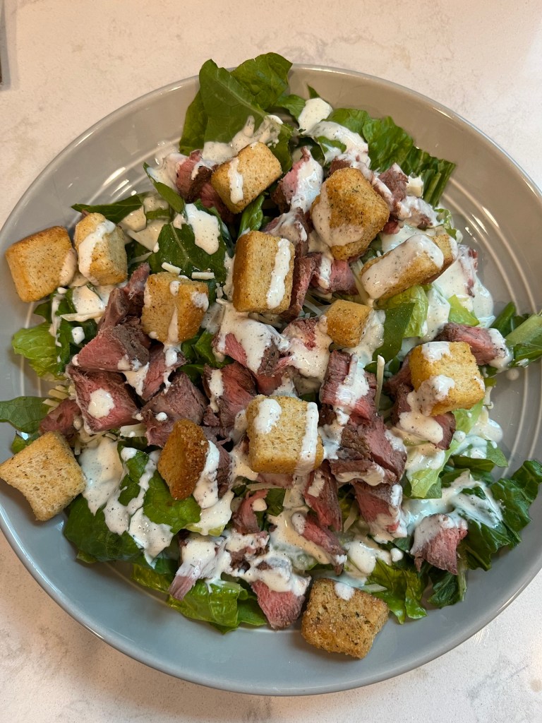 This is a super easy and delicious salad to make for a filling lunch or casual dinner. We had some leftover steaks from the other night, and figured we’d try to add a little pizzazz to our plain ol’ Caesar-ish salad. I say -ish because we didn’t have a traditional Caesar dressing but we did have romaine, croutons, parmesan and a delicious home made (sort of) ranch dressing drizzle.