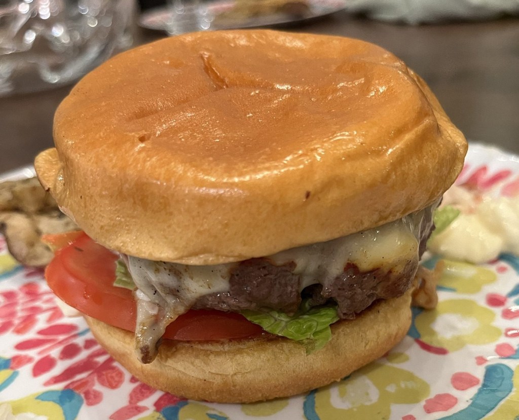 These burgers are SO good and SO easy to make. The secret to a thick, tender, almost fluffy burger? Don’t over work the meat. Mix together the ingredients then loosely pack them, and sear them on a cast iron skillet. They come together in minutes and taste SOOOO good. It’s the perfect weeknight meal when you want something hearty but don’t have a ton of time. We served these with sweet potato fries and a small salad, but feel free to add whatever sides your hearts desire! Potato salad, pasta salad, cucumbers, tomatoes, chips, Doritos, you name it! Yum.