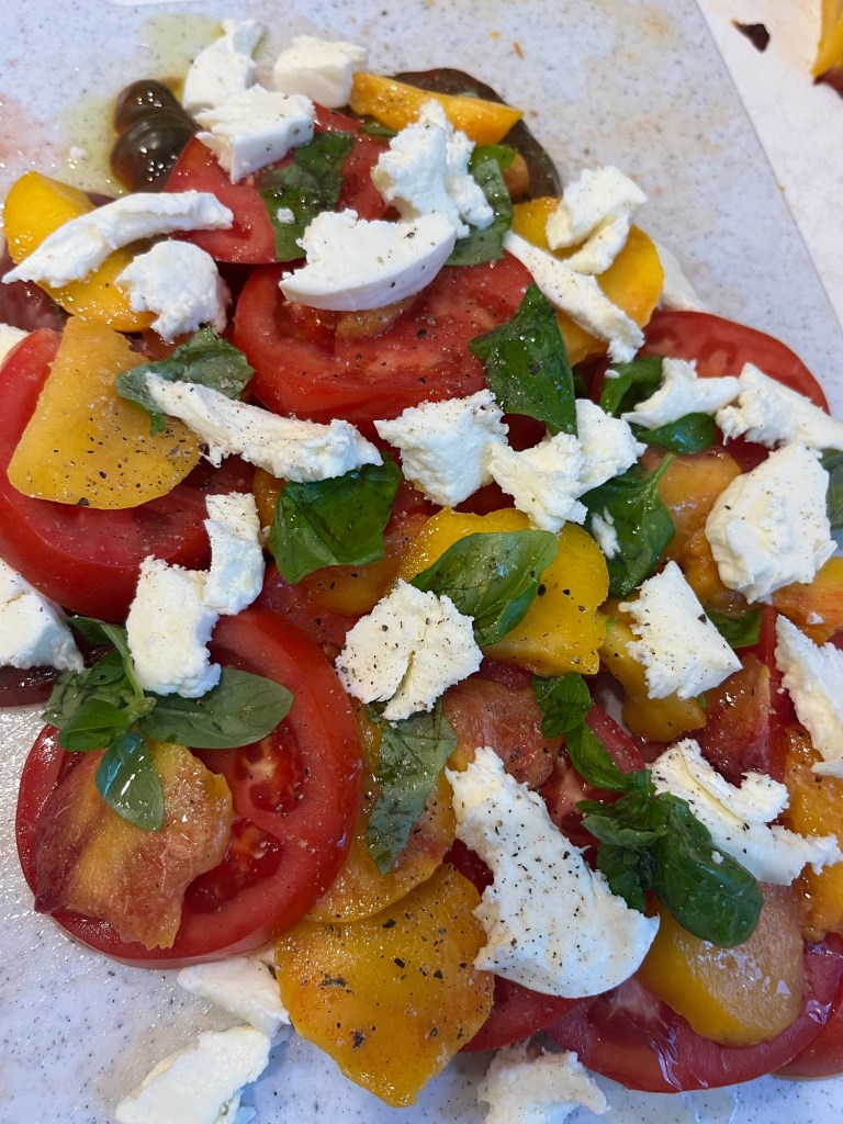 On a cutting board, slice your peaches and tomatoes and mix together. Top with torn pieces of fresh mozzarella (or burrata! yum), basil leaves and drizzle with some good quality extra virgin olive oil. Salt and pepper to taste.